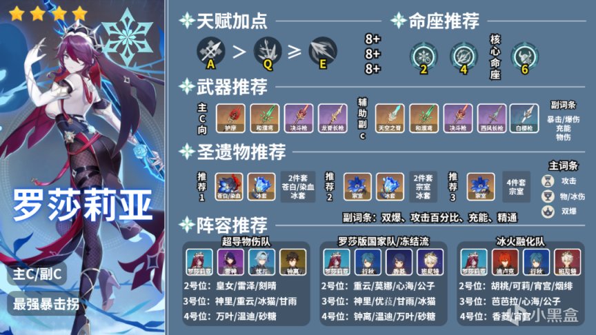 1.从命座来看,罗莎莉亚是一个主c定位,但是输出能力不算很优秀,但是能C能辅。