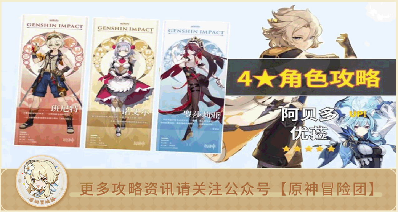 今天给大家带来阿贝多/优菈池四星角色的配装攻略,对于一些变动不大的当期卡池角色,我们计划采用简略的角色卡形式进行展示,方便大家快速了解,详细攻略请查询攻略索引里的内容,我们也会根据环境变化和版本热点定期对大型角色攻略进行重置。