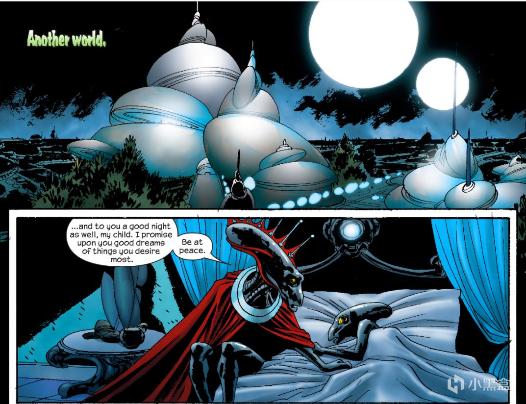 宇宙的另一个角落,某个外星种族的领袖坐在自己孩子床边,温柔地讲述着睡前故事,孩子很快就进入了梦乡。