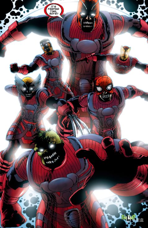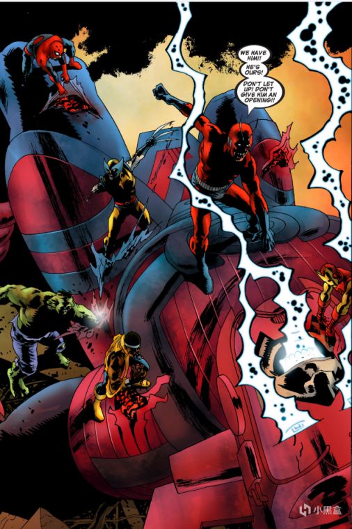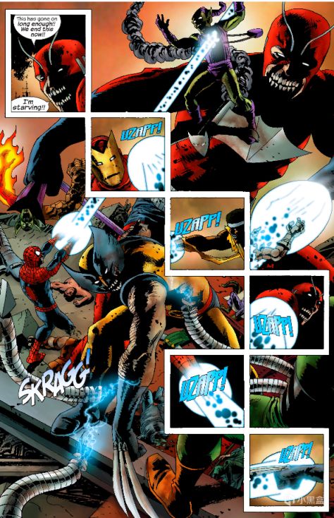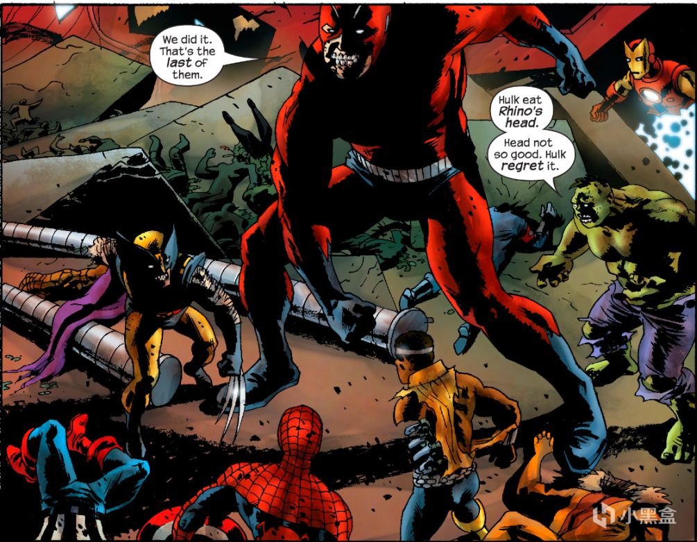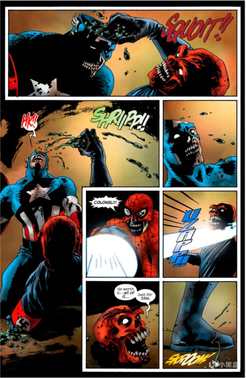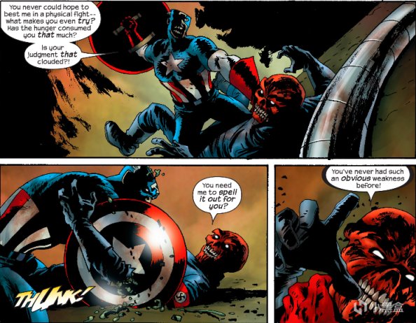红骷髅看着自己的左臂被盾牌斩断,邪魅一笑:“你要我点破吗?你从来没有想如今这般脆弱!”说罢伸手掏出了美队剩下的半个大脑,美队好似断了线的木偶,倒下再也站不起来。小虫怪叫一声,抬手将红骷髅首级砍下,一脚踩爆,也算是为队长报了血仇。