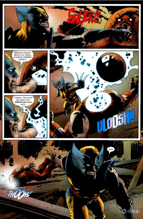 另一边的红坦克还在嘲笑独臂的狼叔,没想到直接被艾德曼狼爪插爆臭嘴,又被注入其中的宇宙能量轰掉首级,狼叔轻蔑地骂了一句“垃圾…”