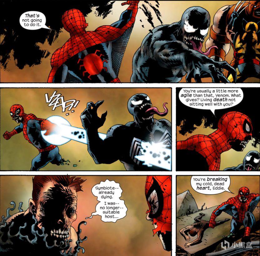 小虫和毒液再次对垒!快如闪电的丧尸小虫绕到毒液背后,一击宇宙光束直接将艾迪射穿,共生体见宿主逐渐死去,便跟着退散,漏出艾迪丧尸化的脸庞,也为两人的爱恨情仇画上句号。