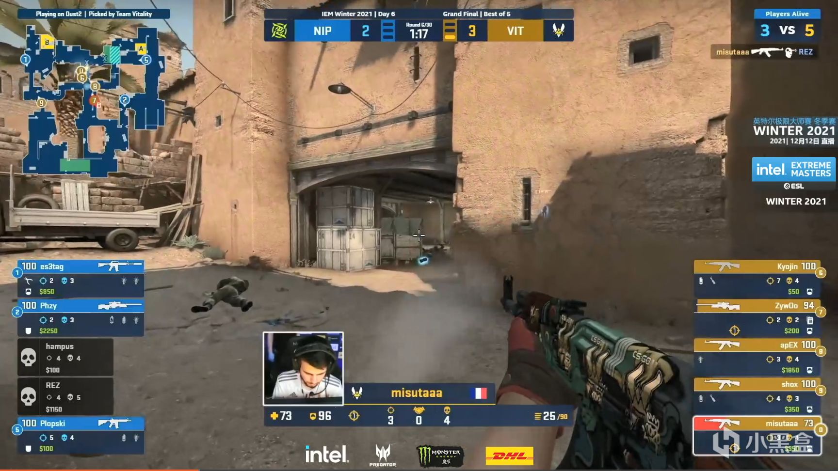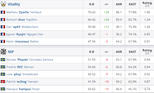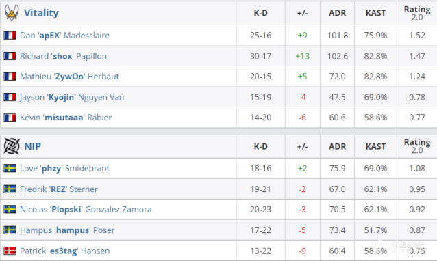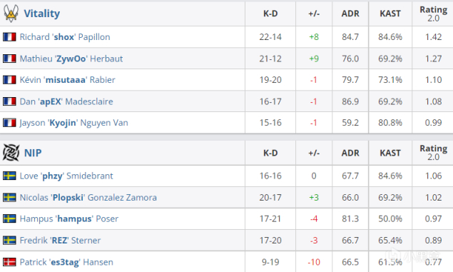 上半场由NIP先做进攻方,手枪局NIP做出3B2A的开局,第二时间NIP集结四人爆弹打B,可包点里的ZywOo和Kyojin没有受到任何干扰,法国男人的手枪更是无需多言,Kyojin直接打出四杀拿下手枪。强起局NIP一路和Vitality打出互换,但最后Kyojin完成1v2的残局没让NIP完成翻盘。送出eco后来到长枪局,Vitality做出三人A2前压但是NIP早有防范,后点架枪收下这三个人头后顺势突破A区拿下长枪。第5回合拿到大狙的ZywOo和Kyojin来到A区,ZywOo在链接拿下首杀后所有的匪徒都将注意力放在他身上,躲在阳台上的Kyojin再次刷出三杀蒸发了NIP。
