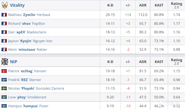 eco过后来到第22回合,祭出双狙的NIP开局就开始收过路费,面对Vitality的第二时间链接夹Aes3tag再打出双杀收下残局。第23回合Vitality再次向链接冲锋,NIP反借机形成包夹将Vitality锁死在了警家,面对众多的枪口Vitality没能再杀出一条血路。第24回合NIP在香蕉道反清时被ZywOo打出四杀硬生生靠着个人能力拿下这关键的一分。经济见底的NIP不想放赛点强刚到底,可错误的赌点让Vitality轻松占领B区拿下赛点。赛点局NIP抢下香蕉道逼迫Vitality只能进攻中路,可中路的交叉火力打残了人但没打死,Vitality并不想做出回报直接拉扯出突破口一波冲A终结了比赛,最终Vitality以16-10的比分先下一城。