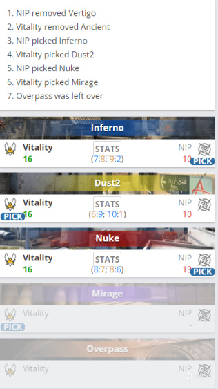 地图BP(NIP选择Inferno,Vitality选择Dust2,NIP选择Nuke,Vitality选择Mirage,图五Overpass)