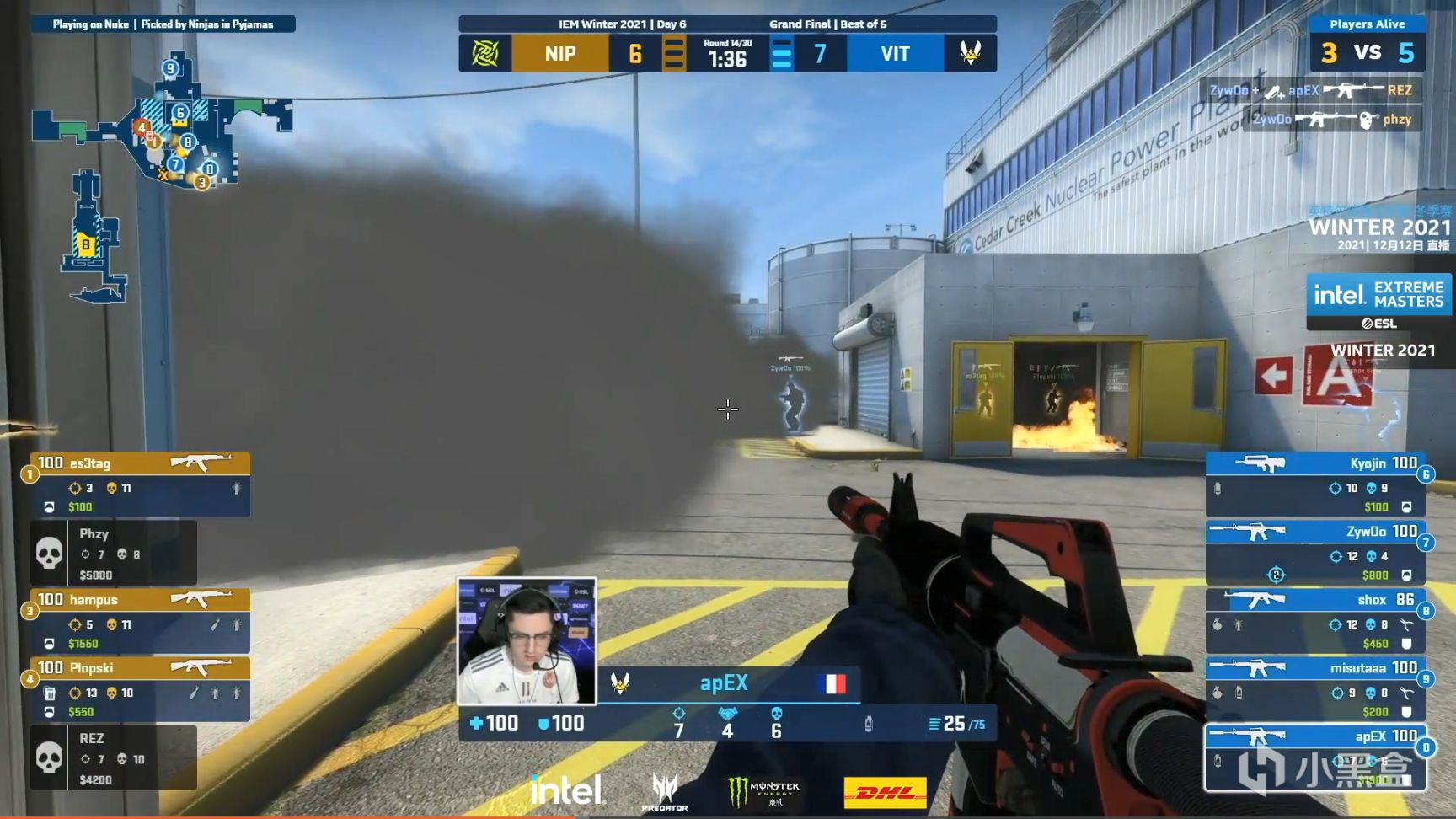 上半场由NIP先做进攻方,手枪局NIP佯攻外场实打铁板,但Vitality没有上当并用交叉火力瞬间蒸发了NIP拿下手枪。NIP纯e攒经济,长枪局apEX在外场混死hampus后NIP转向铁板,第二时间NIP拉出黄房但被shox硬换两个后ZywOo从外场一路摸进匪厅偷到两个屁股收下残局。
