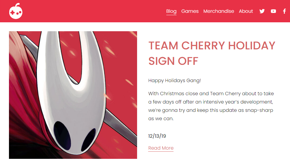 2年前的12月13日,《空洞骑士》开发团队Team Cherry在官网博客上发布了一则年末放假预告。