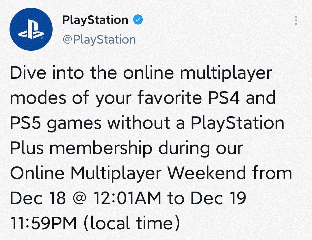 今日PlayStation官方推特账号宣布,玩家本地时间的12月18日上午12点01分至12月19日晚上11点59分,无需PlayStation Plus会员就能体验到PS4、PS5游戏的多人在线模式。当然本次限免的仅仅是多人联机功能,并不可以享受Plus会员的其他特权,比如云存储和会免游戏。