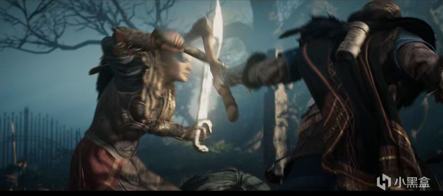 回到剧情,刚见面的艾沃尔和卡珊德拉,那是一个不打不相识,寥寥数语的交谈后,便拾起各自手边的双手斧,打了起来,交手前,卡珊德拉还不忘来一句“我更喜欢用长矛”。本以为半神的卡珊德拉会碾压艾沃尔,但我们这位奥丁圣者也不是盖的,和我们刺客信条战力第一人的卡姐打了个有来有回,交战过场用动画的方式来呈现,却让我看的好不过瘾,尤其是两人双手斧双双断掉后,卡姐左手一把刀(我看着样子有点像奥德赛里面玻尔修斯之刃)右手一把断矛,实在是再熟悉不过的打斗招式了。卡姐用断矛戳破艾沃尔手中盾牌并将其夺下,也是《奥德赛》中的技能招式,当时玩奥德赛,前期遇到高等级带盾的,都是先用这招夺盾,再到高处来一记斯巴达踢,确实这段画面看得我有些澎湃。