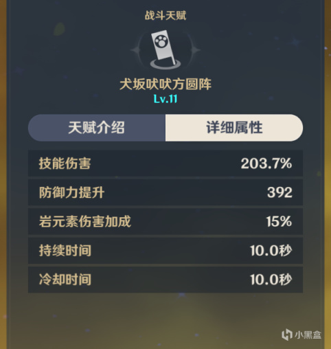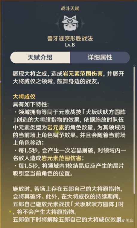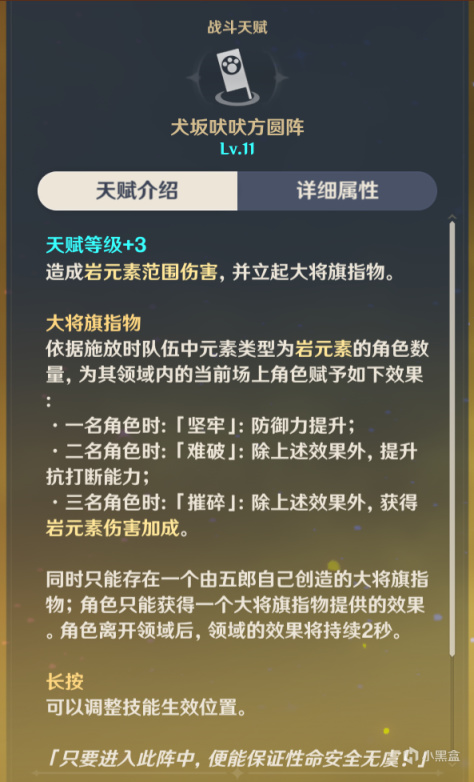五郎的元素战技为给队伍提供固定防御力,并且会按照队伍的岩属性角色提供额外增益效果,拥有两名岩属性角色会提升队伍抗打断能力,三名则提升15%岩属性伤害,这也就是五郎作为岩系专辅的主要技能,并且五郎无法进入别的队伍。并且在领域持续十秒CD同样也是十秒的情况下可以保证技能的无缝衔接(但是由于切人也需要时间所以并非纯无缝衔接)。