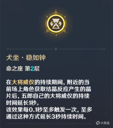 二命提升五郎元素爆发的持续时间,在拾取结晶护盾之后即可触发,也属于轻松触发的命之座,可以延长元素爆发到11秒,配合60级突破的固有天赋可以将双防御力提升间隔延长减少至1秒。