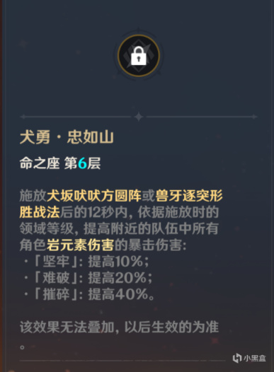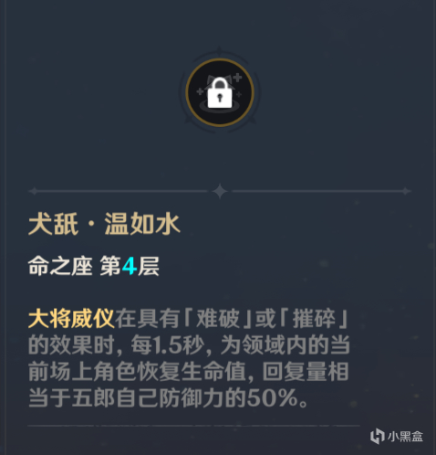 四命赋予岩队部分治疗效果,在携带两名以上的岩属性角色并且开启五郎元素爆发后即可触发命之座效果(但是由于五郎大招CD较长以及能量需求较高,我认为奶量并不算太可观)。