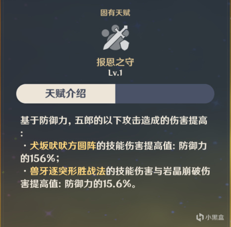 20级突破之后可以获得的固有天赋,五郎开启元素爆发后队伍可以额外获得防御力提升,在0命五郎的下大招结束后还有4秒的持续时间。