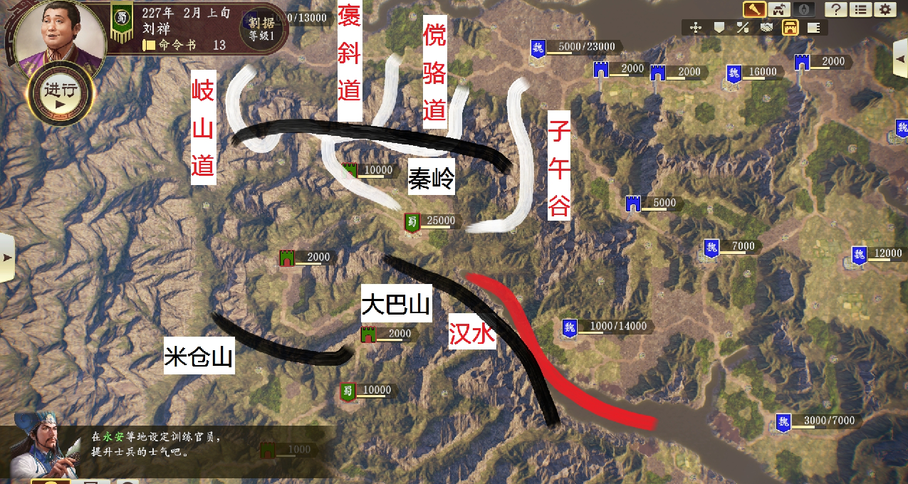 我到游戏中把从汉中出发北伐的线路截了出来,首先不得不说光荣这一代的地形设计真的很赞,还原了很多历史场景。