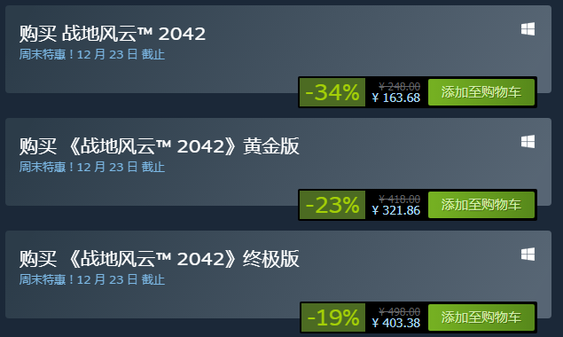 于11月19日刚刚正式发行的《战地2042》现在Steam首次促销中,标准版-34%,原价248.00元,特惠价163.68元;黄金版-23%,原价418.00元,特惠价321.86元;终极版-19%,原价498.00元,特惠价403.38元。优惠截止至12月23日。