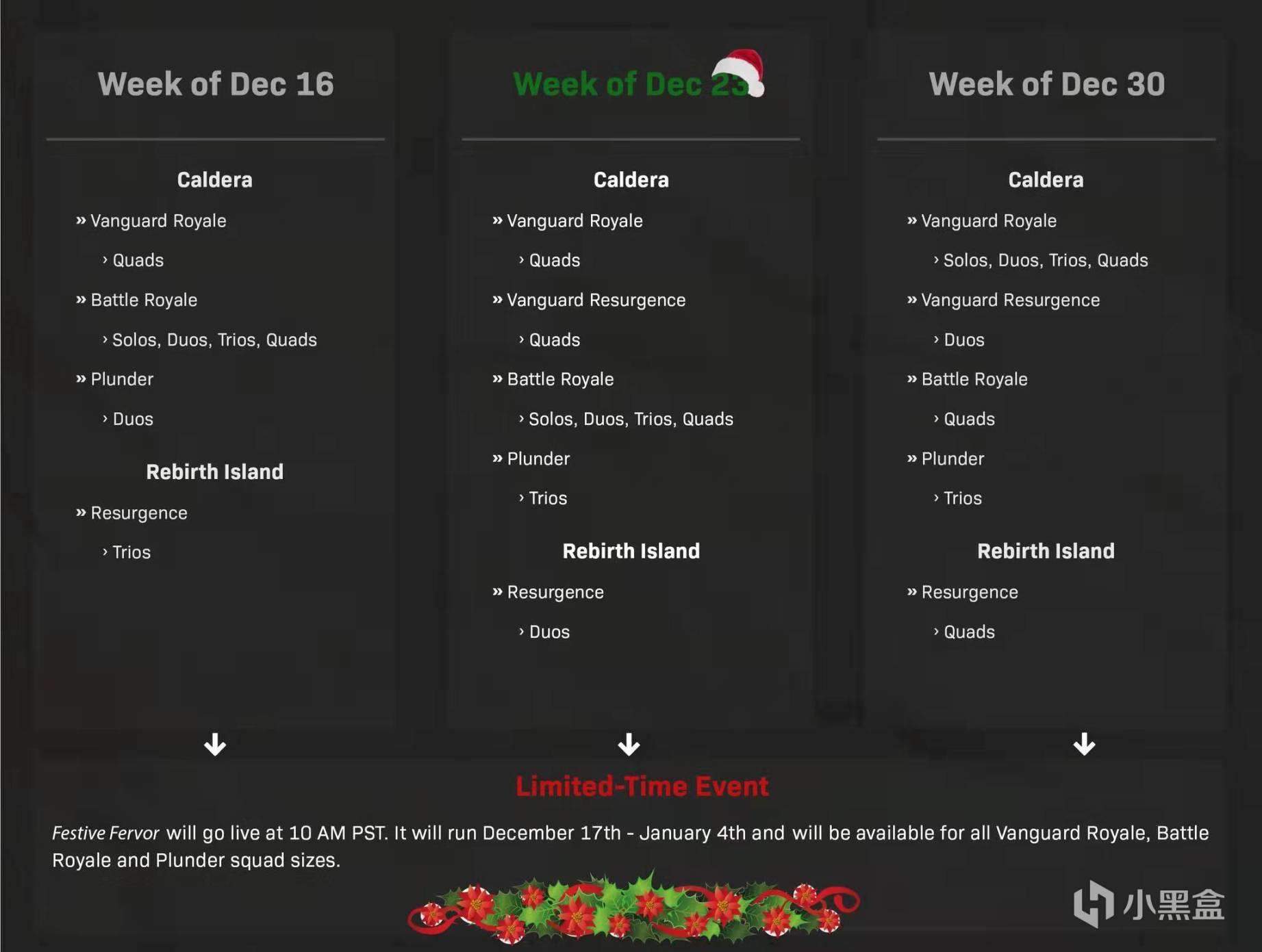 即日起至22日凌晨2:00,玩家可免费游玩《先锋》多人模式的自由杀戮、全年无休圣诞装卸货场和冠军之巅三排。