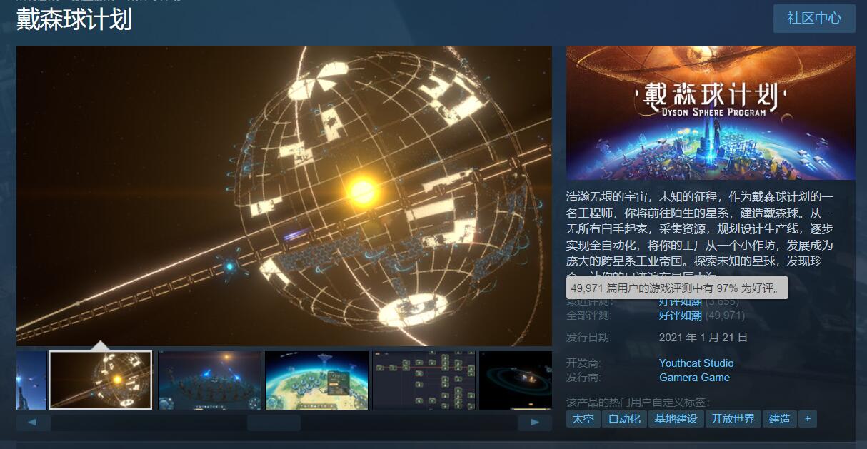 《戴森球计划》是一款融合了太空、自动化工厂、冒险、探索等元素的科幻题材沙盒建造类游戏。玩家可以不断解锁科技、一步步打造专属的戴森球;也可以探索宇宙,发现宇宙珍奇,踏遍星辰大海;或是架设星际物流系统,串联出庞大的工业帝国。它的画面及玩法品质都很精良,是一款实至名归的独立精品。