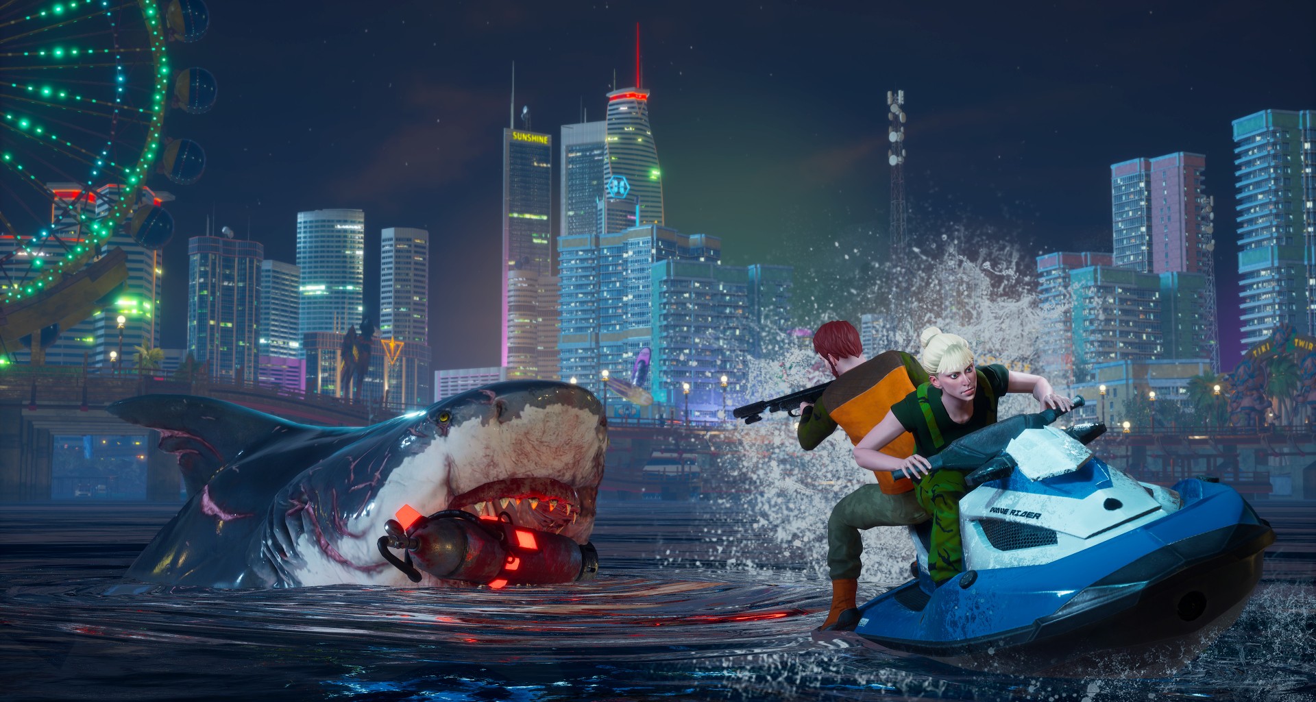- 独立的鲨鱼武装配置系统(鲨人机器)其中包含(头部、尾部、鳍部……)武装,各大属性的武装附加电属性、甲骨属性……后续还有dlc版本附加其余版本。攻击方式多种多样主要包含“普通撕咬、甩尾击退、侧身闪避”,吞食特效也足够炫酷、新颖。地图包含7个大区域,包括墨西哥湾岸区的海湾、度假海滩、工业码头、开放海域等等。具有完整昼夜循环的动态世界~~