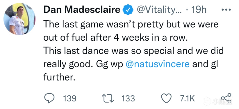 谢谢你们所做的一切。过去的三年太棒了,我永远不会忘记我们在一起的所有时光。最后一场比赛表现不太好,但我们的战舰已经轰鸣4周了,储存的燃料已经寥寥无几了。最后一舞很特别,我们跳得很好。@NAVI,干得漂亮,祝你们好运。