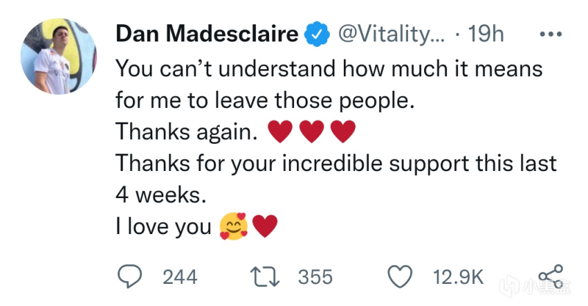 你们不会明白将要离开那些人(这里指Kyojin,shox以及教练XTQZZZ)对我来说有多重要,再次感谢你们!感谢你们在过去4周内的大力支持。我爱你们!
