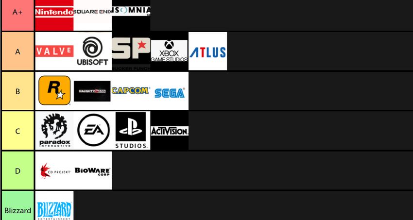 一句话简评:有《英灵殿》,《孤岛惊魂6》为坚实的基础,假如《看门狗:军团》能发挥出色再加上《超越善恶2》能够有新的明显的进展与突破育碧都是有可能来到A+的位置上的。育碧和失眠组在不同tier主要的区别就是失眠组以一个开发组的规模和体量与育碧做到了同样发行两款品质不错的游戏,而育碧却在《看门狗》上失利同时《彩虹六号:异种》我觉得大概率也要扑街。平台独占在我这里扣小分,其余的育碧在游戏大厂当中算是疫情时代的佼佼者了。