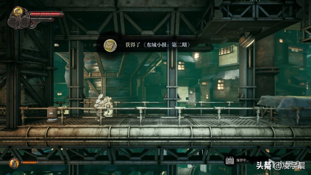 具体来说,虽然我们都知道《暗影火炬城》本质上是一款横板动作游戏,咱们操作着兔子主角只能左右和上下移动,整个板面不存在深度这种设定也就是说并不能左右移动让角色和敌人不处于同一条直线上。但制作组还是玩出了花样在画面设计上别出心裁,用3D建模来完成2D构图并且在景深方面下了大功夫,各种延伸向远处的巷陌颇有种“引人入胜”的意味,我自己在刚上手时是总有种想按“上”键走入当中的冲动,虽然后来尝试了一下知道是错觉但这种画面的吸引力可见一斑。