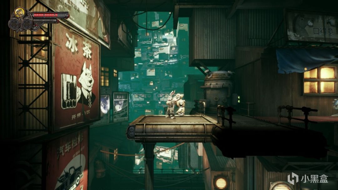 而场景中的各种小细节同样值得探究,不管什么时候您只要停下都是一幅让人心驰的画卷——其中最让人称道的无疑是制作组加入的各种富有时代气息的广告和标语了,浓郁的中式元素带来的亲切感与动物们出演的滑稽感交织。而可互动的小细节制作组也为我们准备好了,比如击打场景中的灯会导致灯光晃来晃去,而存盘是会有一个全自动的机器给咱们的兔子主角全面养护包括刷毛什么的都一起做了,可以说整段旅程充满了不期而遇式的趣味性。