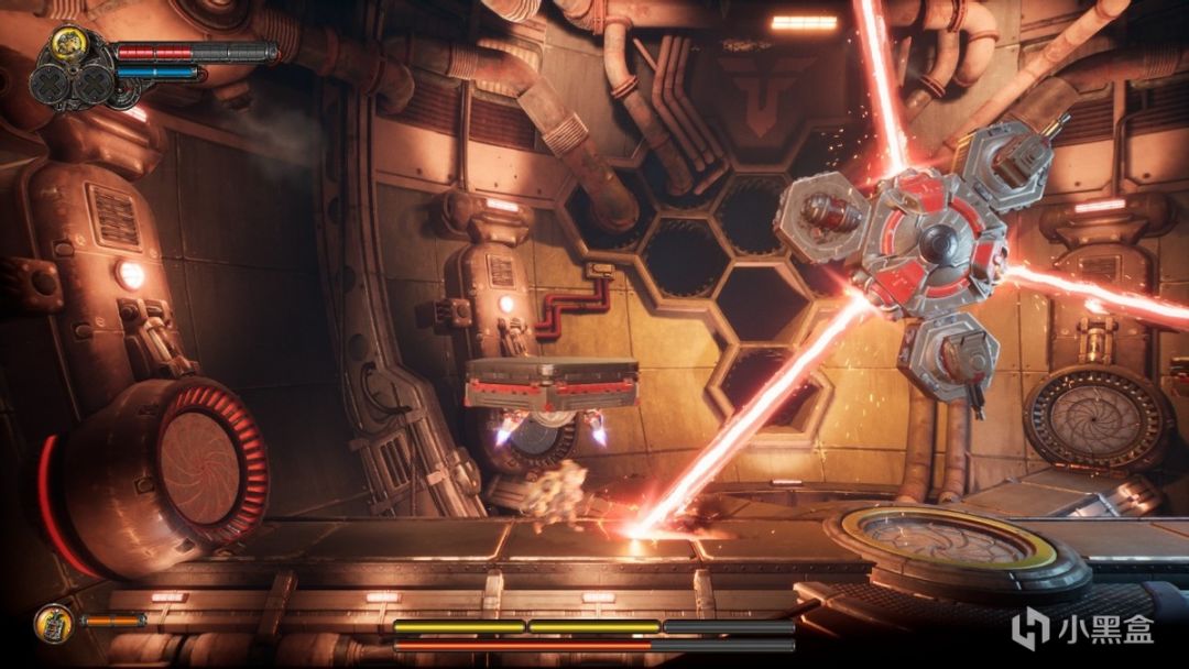 而解密&跳跃部分就比较让人抓狂了,解密是单纯地摸不着头脑这个咱们不谈,毕竟可以看攻略、看视频教学过去。但跳跃部分就没办法作弊了,特别是本作中跳跃对玩家的操作能力要求非常高,很多时候需要各种眼疾手快连续跳跃+冲刺,不然一不小心碰到机制就会扣血或是重头再来什么的,老实说我甚至觉得比打BOSS费劲多了。让我印象最深的当属旋转齿轮,由各种向左向右的多层齿轮构成的本关卡两侧还会有电流机制,齿轮走到边缘就会把人物挤下去,而不小心碰到电流就会硬直啊弹飞啊,相当难受。在这里我足足纠结了10分钟才最终到达顶端,颇有种玩极难马里奥的感觉。