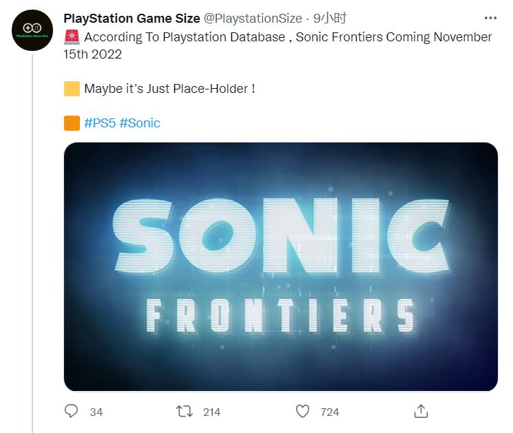 在今年的TGA中,世嘉公开了旗下经典IP《索尼克》系列新作《索尼克边境(Sonic Frontiers)》,推特账号@PlaystationSize今天爆料了本作的发售日,预计将于2022年11月15日发售。