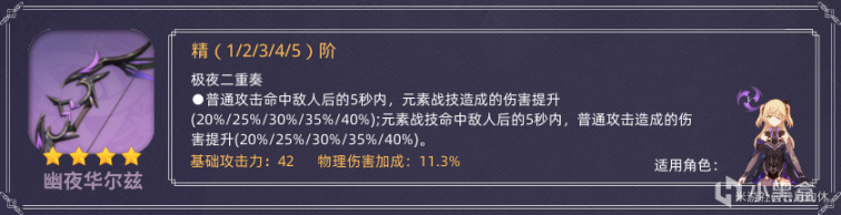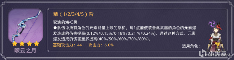 这把武器算是大月卡系列里混的最惨的了,虽然副词是加爆击的,但是在目前的主c射手角色里,都有更好的武器替代。