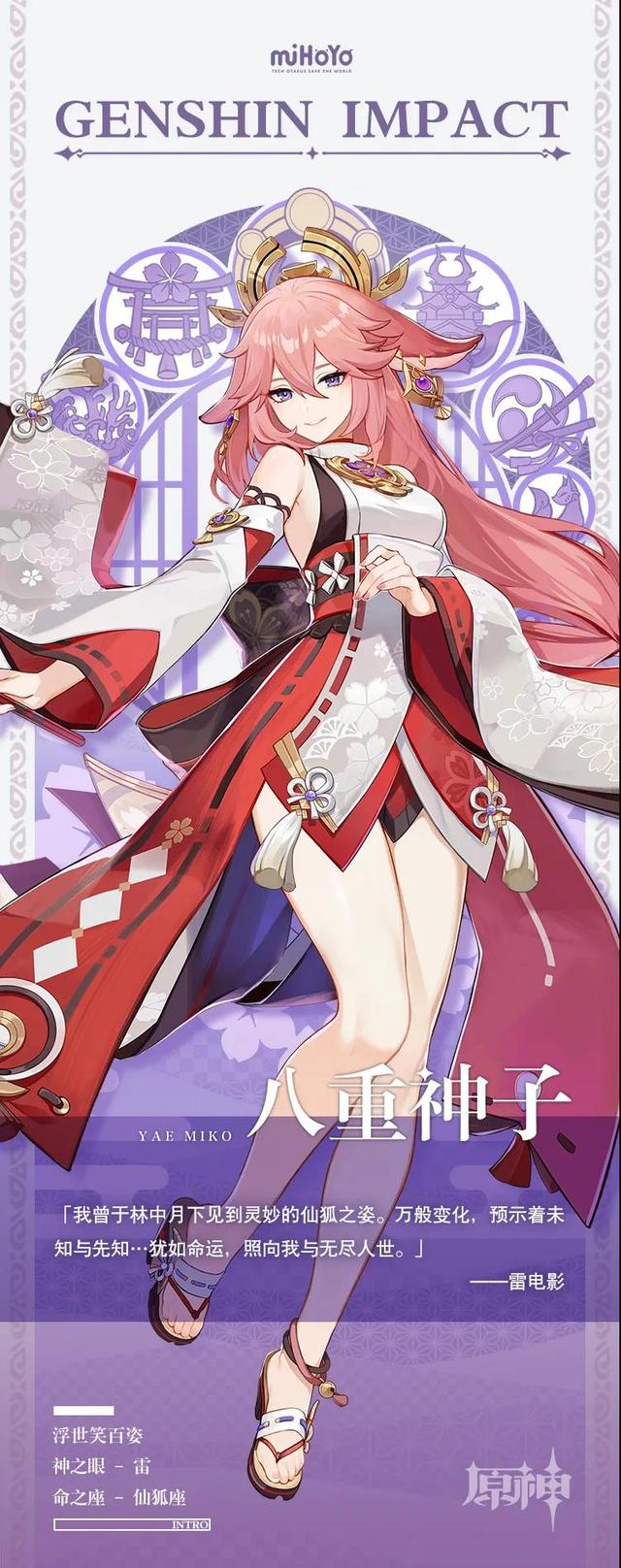 简介:在新年的第一天,官方就发布了八重神子的立绘,作为雷电将军的最好闺蜜,亲自为神子作了评语:“犹如命运,照向我与无尽人世。”