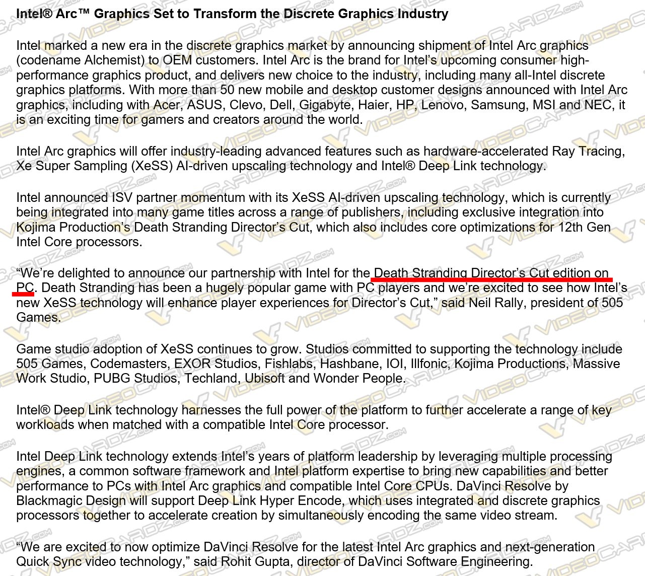 近日,英特尔Xe超采样AI驱动分辨率提升技术(简称XeSS)消息提前在网上泄露(该内容原计划在稍后的CES展会上公开)。其中就特别提到了PC上面的《死亡搁浅:导演剪辑版》。