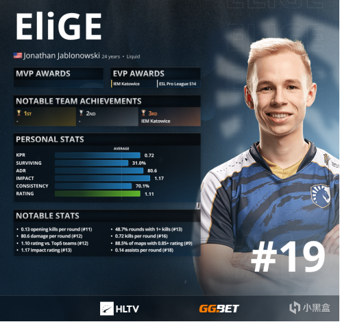 在对阵一线队伍时的不俗表现以及在比赛中的持续影响力使EliGE连续第五次进入了top20名单。