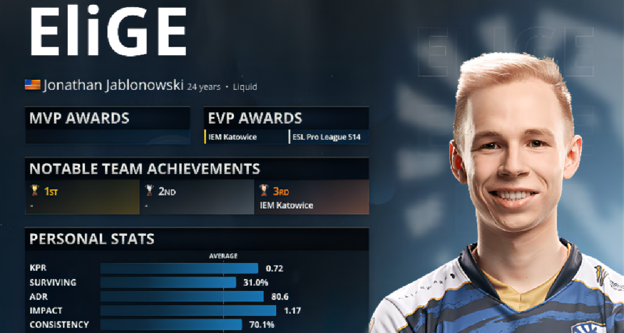 2017年是EliGE首次出现在top20的排名中,排在第12位,此时的他与Twistzz一起成为了Liquid的稳定力量,帮助队伍在ESG Tour 米克诺斯和ESL One 纽约获得了亚军。