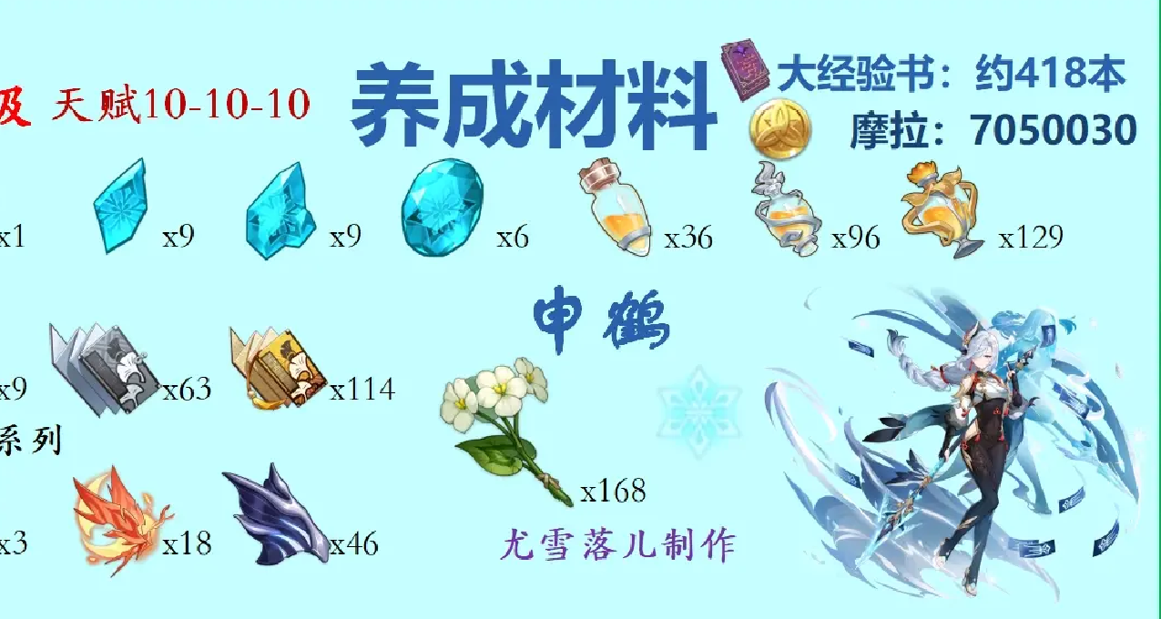 如下图所示,申鹤拉满需要46个深海龙蜥掉落「龙嗣伪鳍」、168朵「清心」、18个女士掉落的「狱火之蝶」、114本「繁荣的哲学」等养成材料。