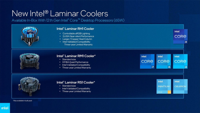 英特尔还推出了三款新的散热器,与 65W 处理器捆绑盒装销售: