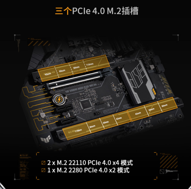 该系列主板采用 10+1 相供电设计,具有 TUF 电容、电感,提供高强度供电接口,依旧提供全方位风扇控制功能、活动式 M.2 散热片。该系列主板为 CPU 供电提供 4+8 pin 接口,可以支持更高功率的 CPU。