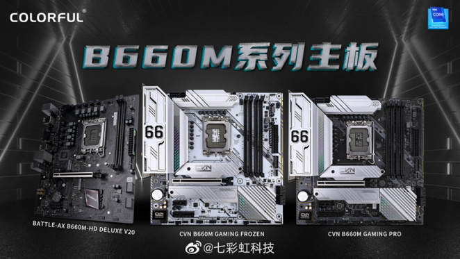 七彩虹正式推出了 CVN B660M GAMING 系列以及战斧 B660M-HD DELUXE 主板,首批共三款产品,均采用 M-ATX 版型。主板搭载英特尔 B660 芯片组,采用 LGA1700 插槽,支持 12 代酷睿处理器。