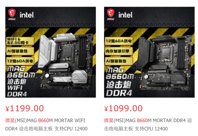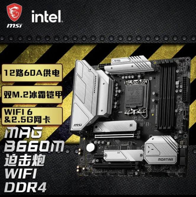 微星发布 H670 / B660 / H610 主板,提供 DDR4 和 DDR5 双版本。现已上架 B660M 迫击炮主板,支持 DDR4 内存,兼容 12 代酷睿桌面处理器,普通版售价 1099 元,Wi-Fi 版本售价 1199 元。