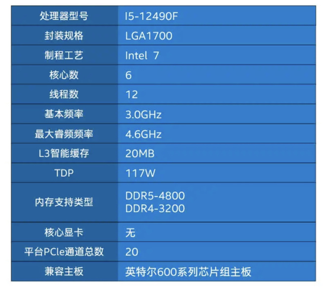 i5-12490F 是中国大陆游戏市场特供型号,6 核 12 线程,最高 4.6GHz,20MB 三级缓存,三级缓存达到 i5K 级别。相比普通版的 i5-12400 频率更高,三级缓存更大。