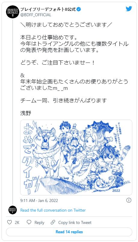 浅野智也最近发布了一条推文,欢庆新年的到来。他说道:“除了《三角战略》,我们还计划在今年公布和发售几款其他的游戏。敬请关注!”当然了,这里所提到的新游戏不一定是主机游戏,也有可能是手游——比如即将登陆iOS和Android平台的单人RPG游戏《勇气默示录:绚丽之光》。