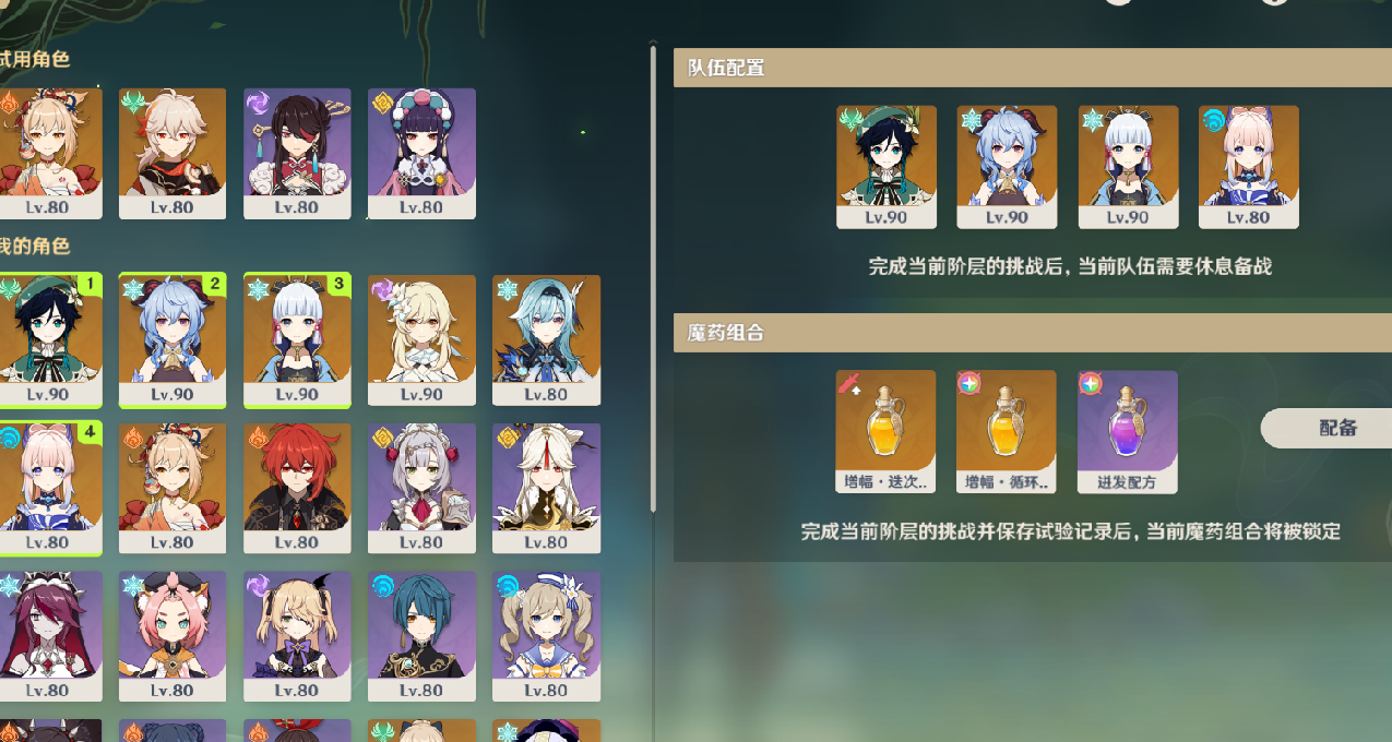 第四层(永冻队):能够卷起的小怪很多,所以同样推荐永冻队,没聚怪角色的可以用试用里的万叶,这次可以把元素爆发相关的药剂都用上了,这场除了最后镜女血厚稍微慢点,其他都是各种秒。