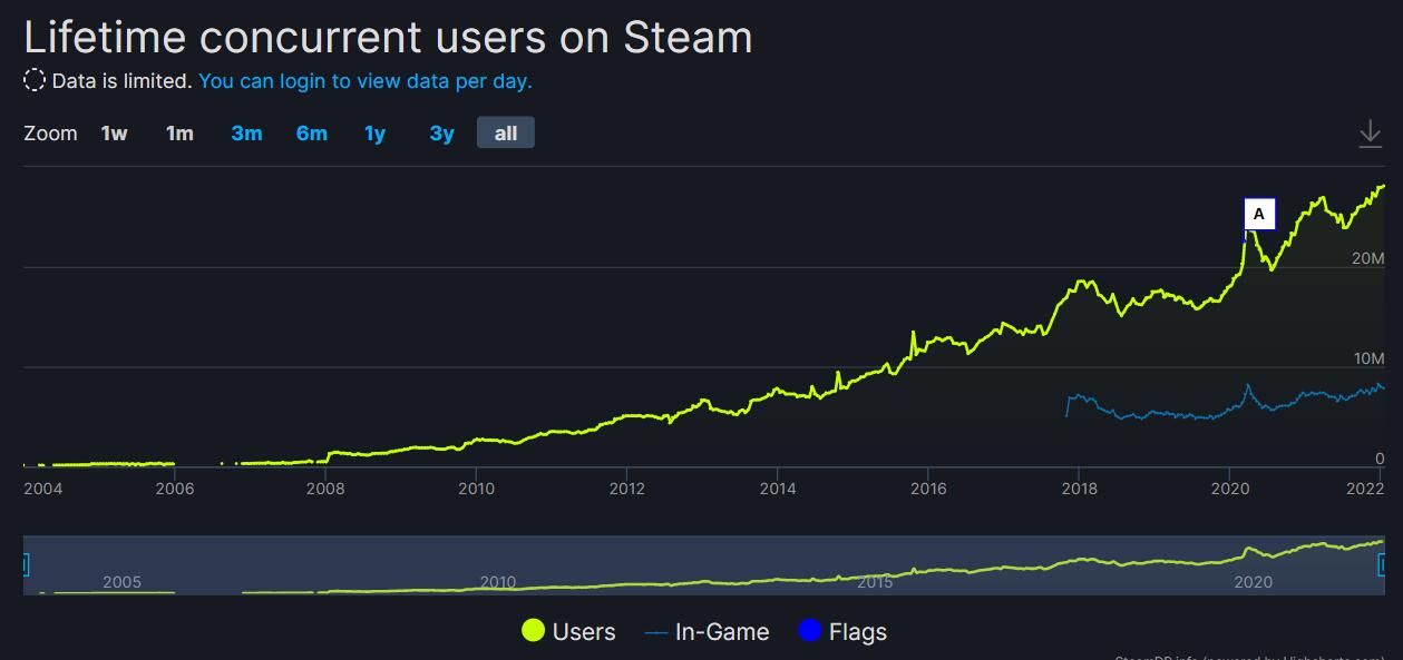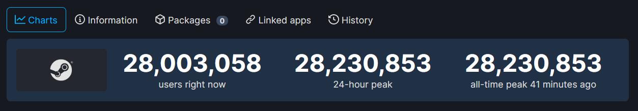 1月9日晚最新消息,Steam游戏平台同时在线玩家数首次突破了2800万人!根据SteamDB,昨晚最高有28230853名用户同时登录使用Steam,这是Steam有史以来的最高在线纪录。