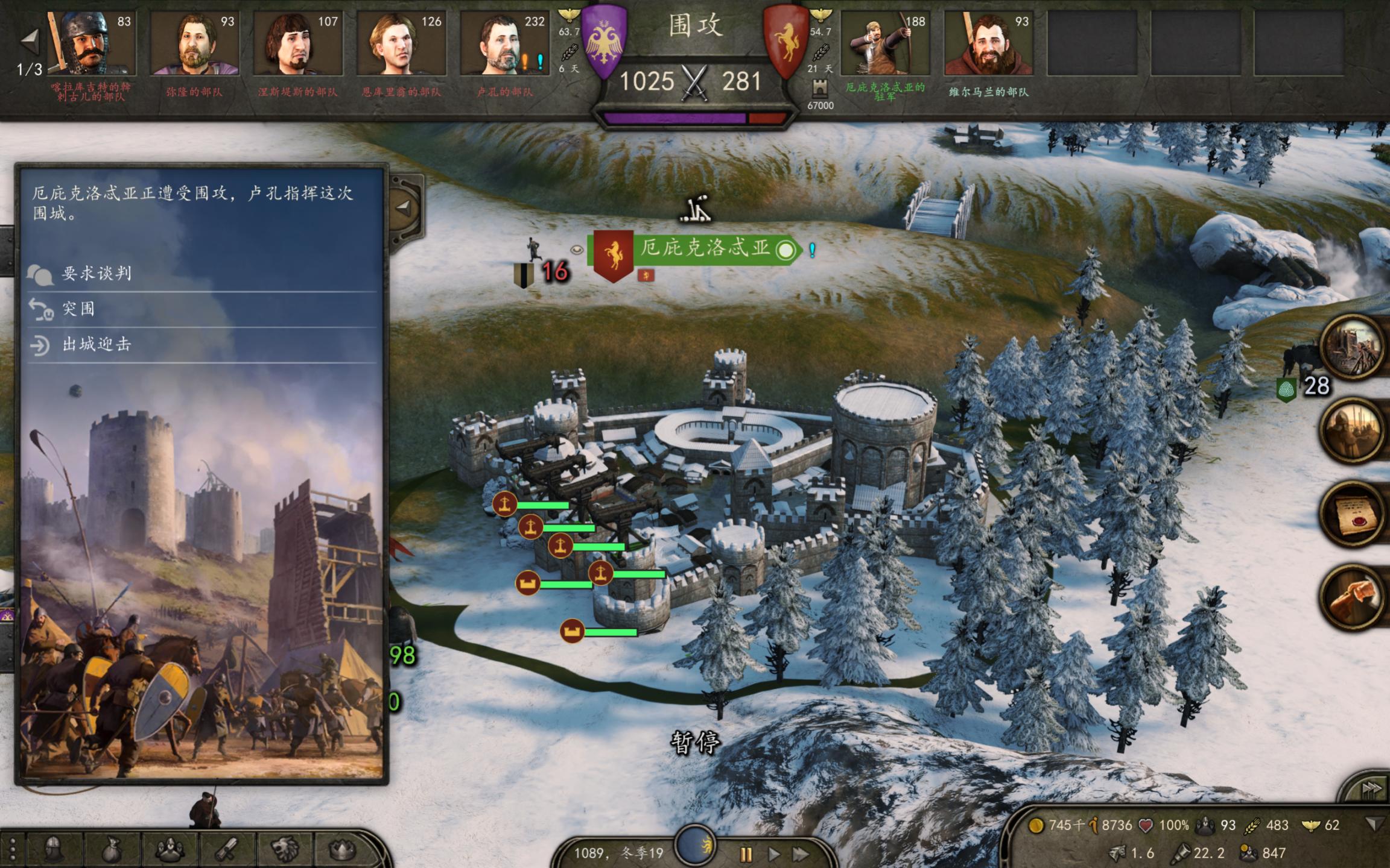 接下来是今天玩的,我被一千多的军团给围城了,但在B站又学了一招,守城是用弩炮杀敌,可以刷熟练度,然后城门要被攻破了就撤退,再守城,敌人又得重新开始攻城。之后这一千多人的大部队被我二百多的守军给磨死。