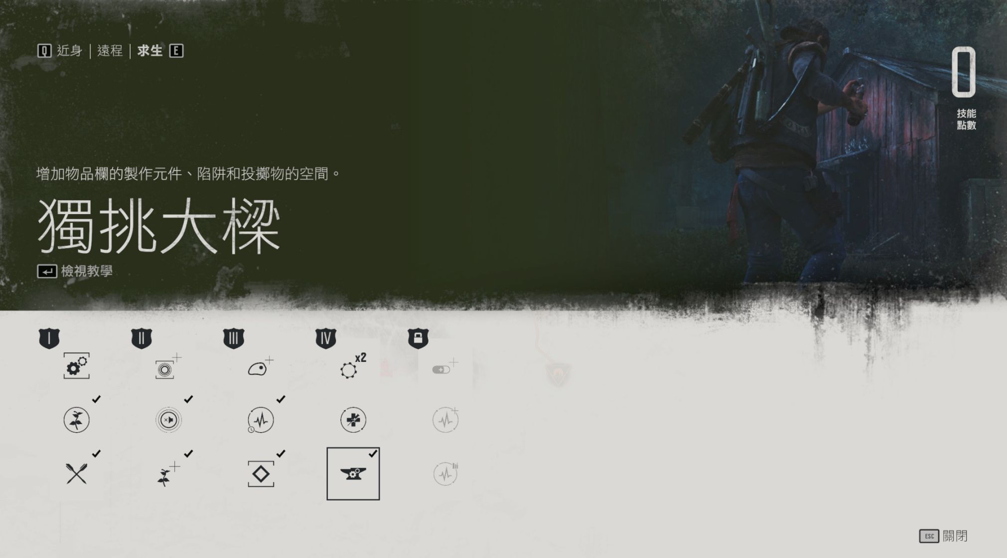 技能模块分三大类:近身、远程以及求生。每一项内容中都有鱼龙混杂的成分,甚至有些技能堪比鸡肋,食之无味,弃之可惜。对于初入恶土的幸存者而言,需要认真鉴别其实际应用效果。这里梳理出笔者推荐的几个必点的重点技能。(前置条件必须要点)