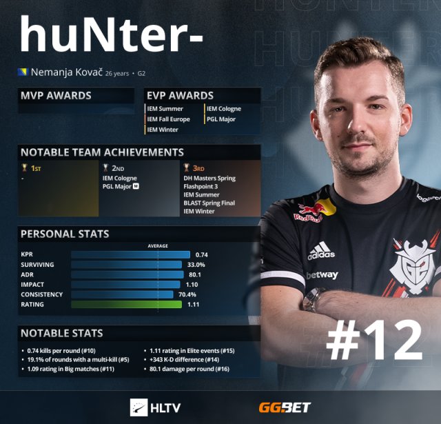 转眼之间,huNter很快适应了新的环境,并融入了一线比赛。凭借2020年初的优异表现,使得他在2020年被评选为Top13,他在年初的前四场比赛中带队拿下三个亚军,其中包括含金量十足的IEM卡托维兹。随后,G2这一年的进展有所放缓,但对于huNter来说,这并不是一场悲剧,相反他维持了稳定的发挥,并实现了毕生的梦想,与表弟NiKo一起联手打比赛。