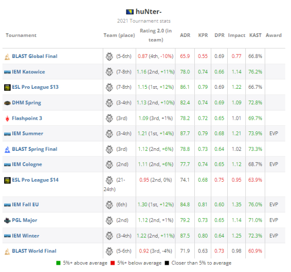 在EPL S13上再次以前八的成绩完赛后,huNter也凭借其稳定的数据成为了队伍里rating最高的选手,值得一提的是他是本次赛事中伤害输出最出色的选手之一(86.1 ADR,排名第五)。成功突围BLAST Showdown和IEM冬季赛预选赛后,G2迎来了属于自己的上升期,他们也不断提升自己,并在接下来的五场赛事中都至少打进了四强。