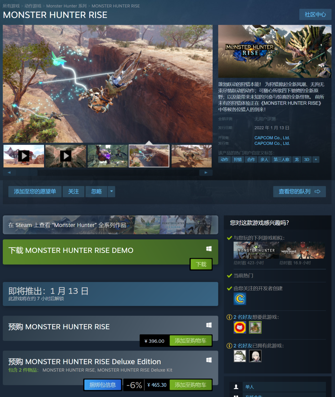 2022年1月13日,《怪物猎人:崛起》的PC版本上线了,396元的基础版价格,以及465.3的豪华版价格,都快赶上世界和冰原的总价了。