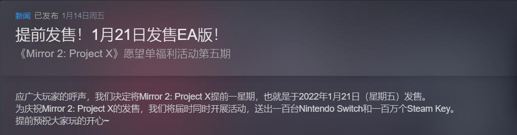 除了发售日提前外,官方还展开了一项“愿望单福利活动”,将会送出一百台Nintendo Switch和一百万个Steam Key(不清楚“一百万”是不是写错了)。