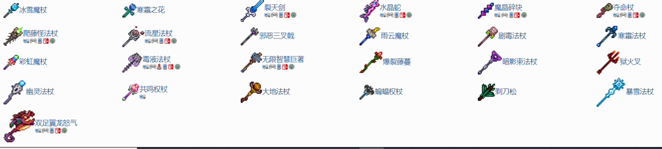 对于泰拉人来说,这个游戏引以为傲的便是其优秀的武器系统。在一开始游玩的时候很难想象这个小小的2D游戏可以做的这么复杂,武器类型包含了剑、矛、弓、枪、法杖、召唤杖甚至悠悠球等,其作用也是有近战、远程和塔防几类的。